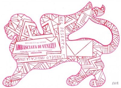 Il Leone Rosso è il simbolo dell’Ambasciata di Venezia spazio creativo attivo aperto agli artisti dei cinque continenti che hanno qualcosa da condividere. Nello stesso tempo il Leone Rosso è uno stimolo a partecipare in maniera attiva e concreta in modo da combattere il virtuale e l’effimero sempre più favoriti dalla depressione culturale che investe in questi ultimi tempi anche la rete della Mailart grazie ad un uso distorto di internet che spesso sembra solo l’esaltazione di una non partecipazione da parte di un crescente numero di mediocri che proclamano ai quattro venti scoperte valide solo per coloro che ignorano il percorso significante degli altri. Il progetto è ambizioso e trova le sue radici già negli anni ottanta dell’altro secolo. Testimonia un percorso parallelo e non certo secondario a quello di un sistema dell’arte che già decenni fa ci appariva insufficiente ad esprimere le nuove realtà. Ora il Leone Rosso costituisce una bandiera in cui riconoscersi e con cui operare ma anche la volontà per non cadere nel banale e nel déjà vu. GIANCARLO DA LIO